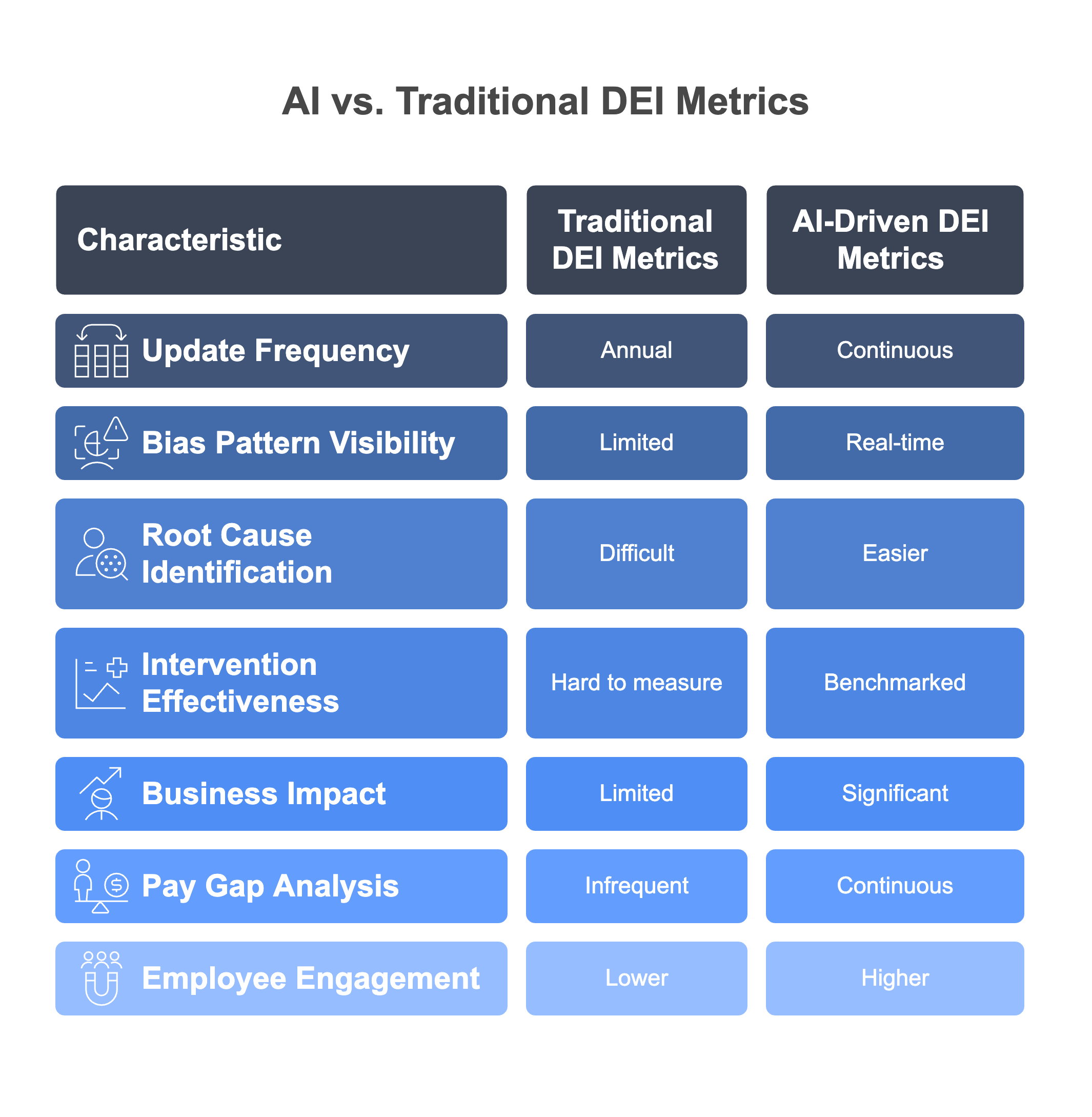 Traditional DEI metrics update annually whilst organisations struggle to identify root causes of diversity challenges and measure intervention effectiveness.