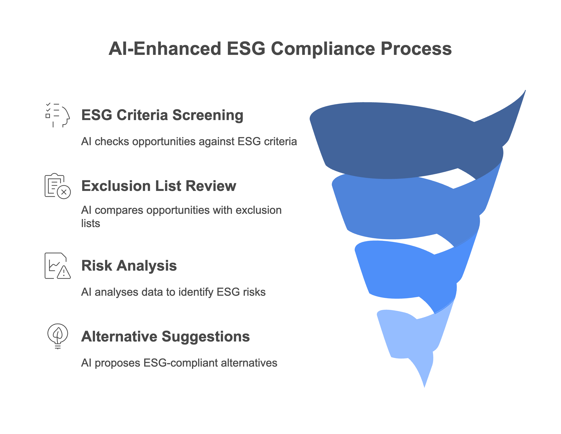 Natural language processing and machine learning automatically screen investment opportunities, vendors, and business partners against ESG criteria before approval.