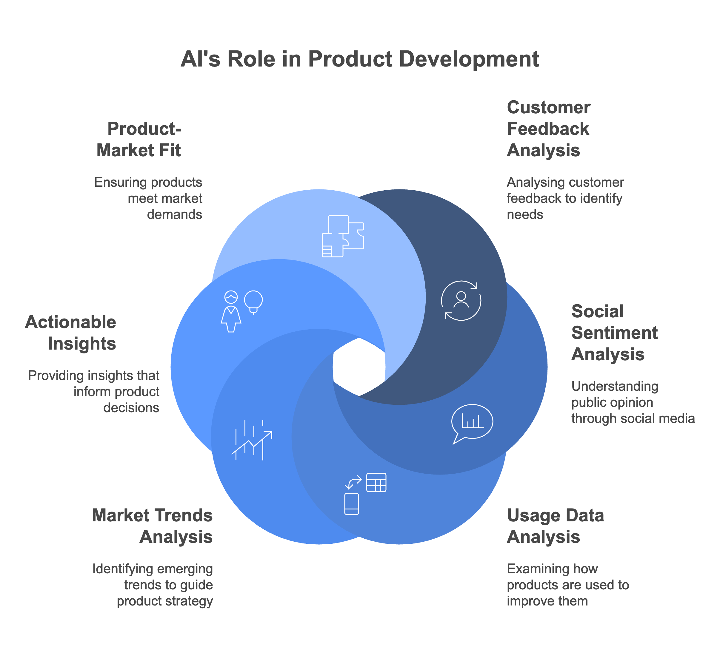 Machine learning and natural language processing analyse customer feedback, social sentiment, usage data, and market trends to provide actionable insights that guide product development decisions.