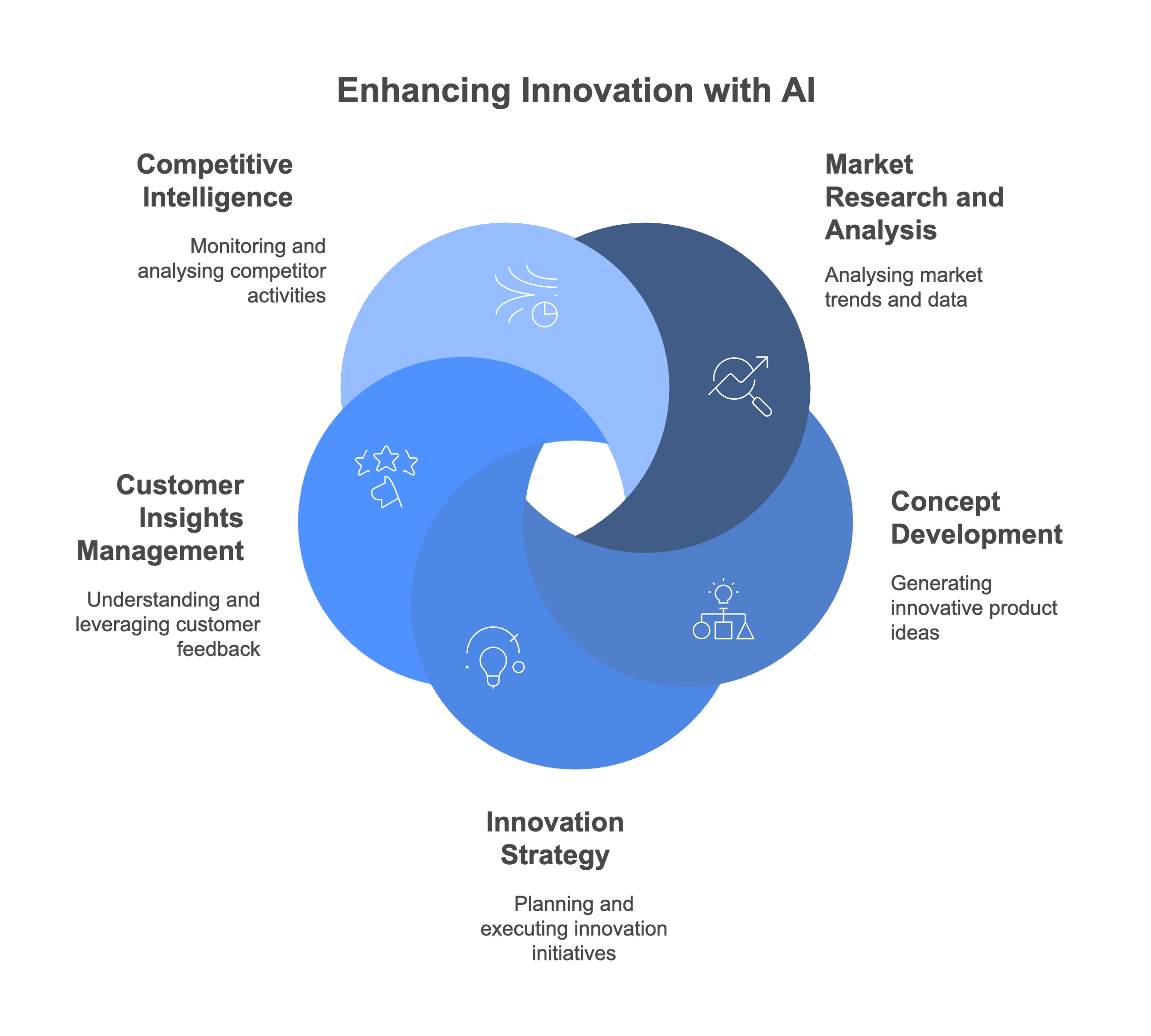 Market Research and Analysis, Concept Development, Innovation Strategy, Customer Insights Management, and Competitive Intelligence capabilities are directly enhanced through intelligent analysis and automated concept generation.