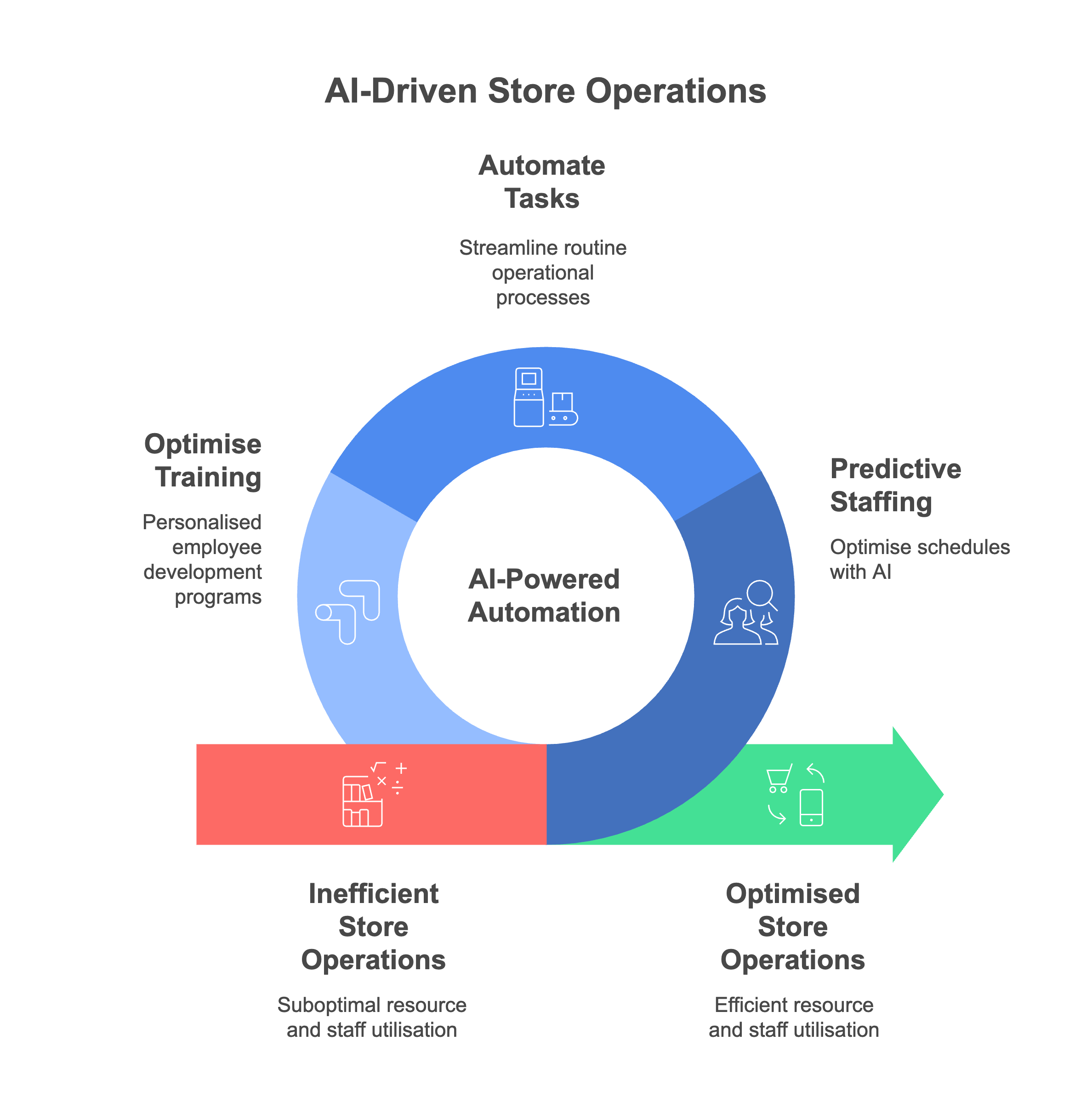 AI-driven operational systems optimising staffing schedules, automating routine tasks, and enhancing in-store customer service through predictive analytics and intelligent automation technologies comprehensively.