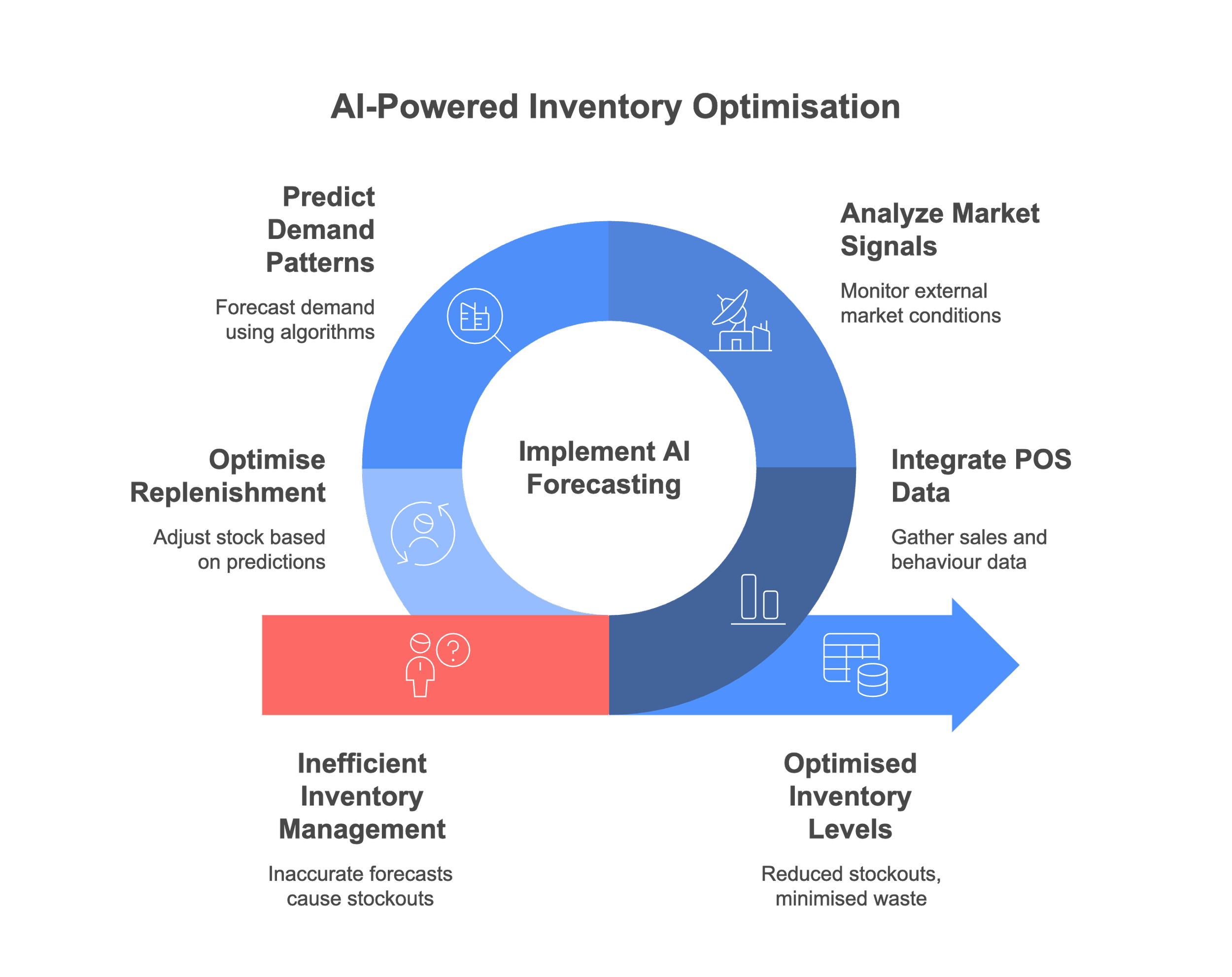 AI-powered demand prediction systems analysing consumer behaviour, market trends, and external factors to optimise inventory levels, reduce stockouts, and minimise waste across channels and locations.