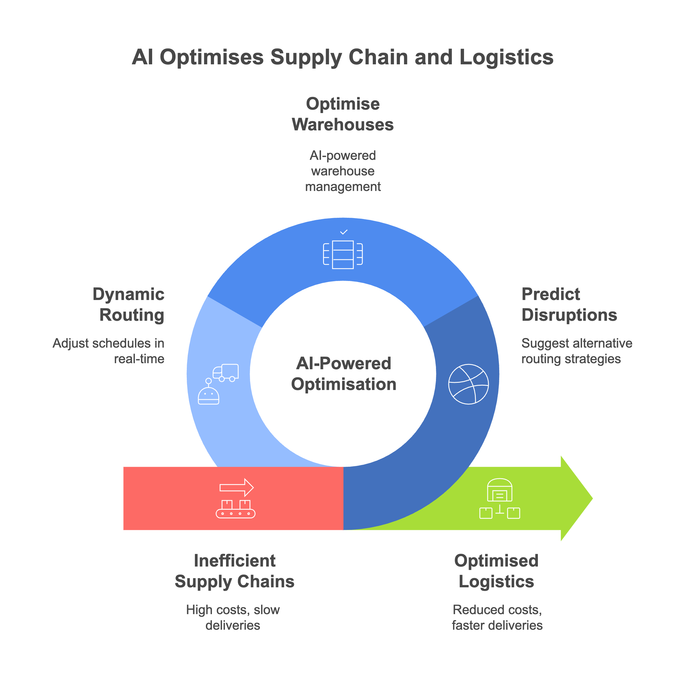 AI-enhanced supply chain management systems optimising procurement, transportation, and distribution networks to reduce costs, improve delivery performance, and enhance supply chain resilience comprehensively.