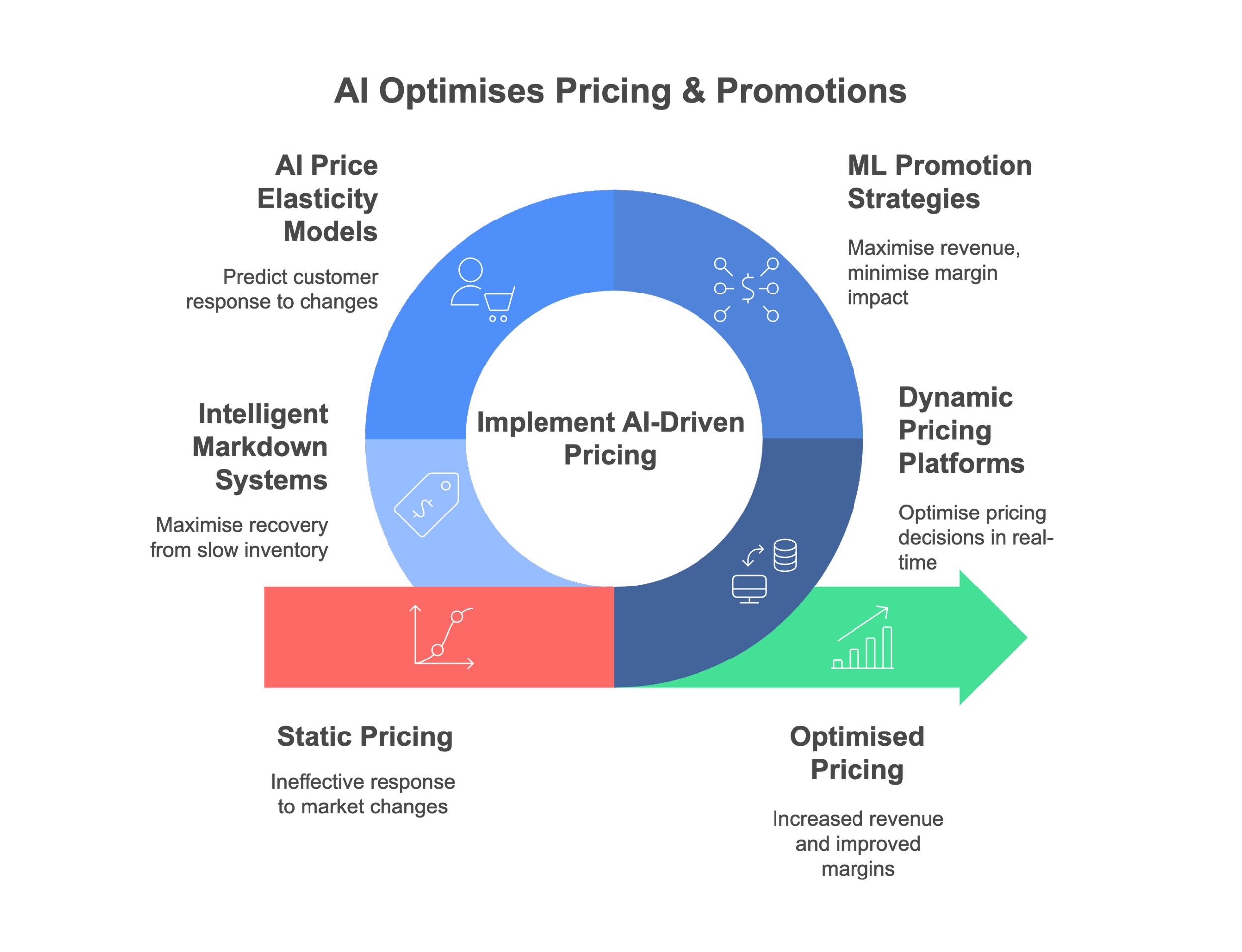 Intelligent pricing systems dynamically adjusting prices and promotions based on demand patterns, competitive dynamics, and market conditions to maximise revenue and profitability across product categories.