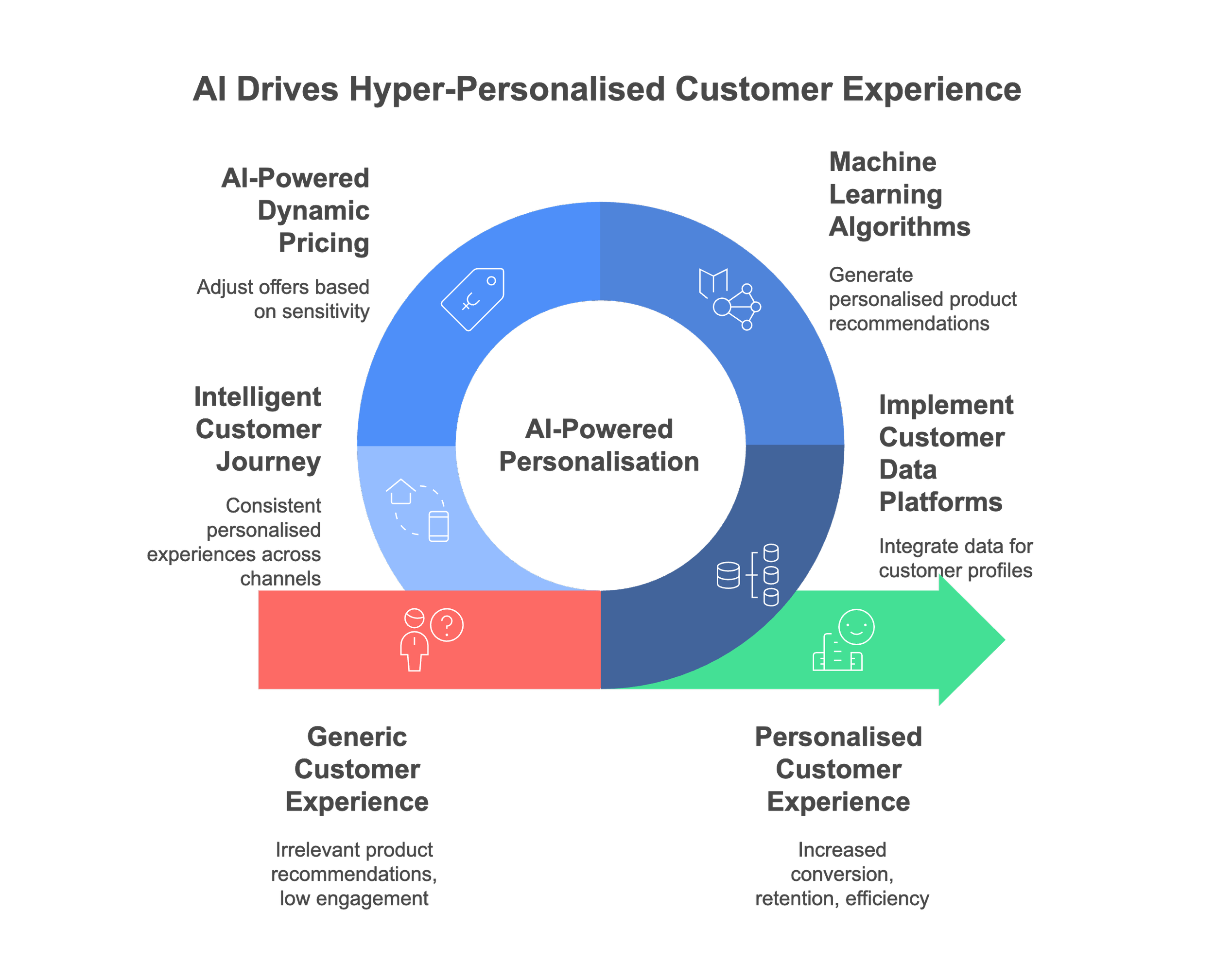 AI-driven personalisation engines analysing individual customer preferences, behaviours, and purchase history to deliver tailored product recommendations, marketing messages, and shopping experiences across touchpoints.